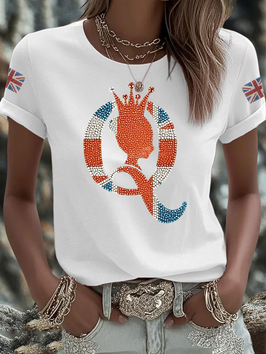 Women's British imitation diamond hot-drilling Printed Iron On Short Sleeve T-Shirt